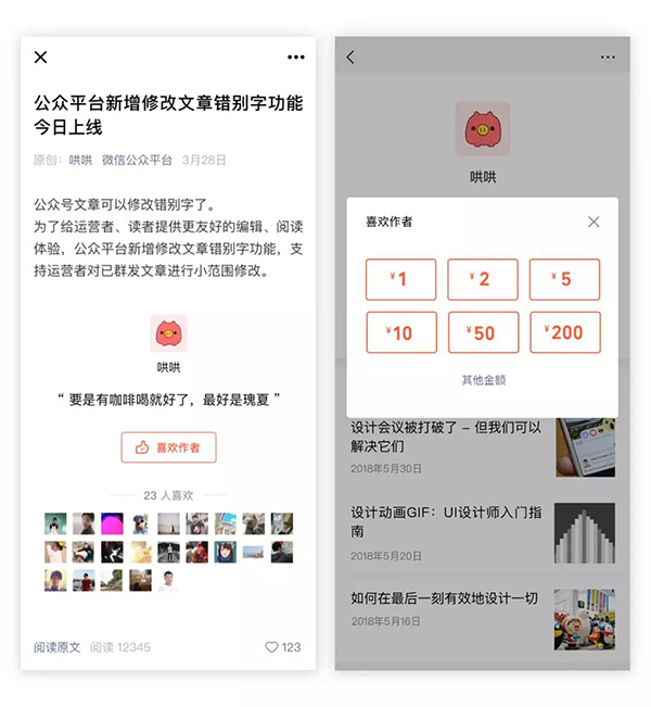 公眾號贊賞功能升級為“喜歡作者”,開啟了贊賞的文章在原創(chuàng)文章底部有“喜歡作者”的入口。在 iOS 版和 Android 版微信上都可以使用。