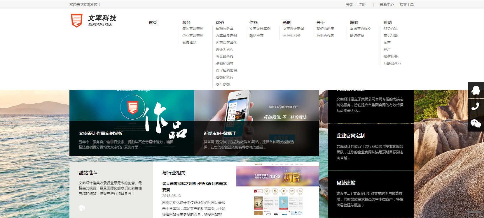 網(wǎng)站導(dǎo)航的設(shè)計(jì)要么千篇一律,沒有絲毫新意;要么千奇百怪,讓人無法理解;專注網(wǎng)站的網(wǎng)站導(dǎo)航設(shè)計(jì)應(yīng)該站在客戶和企業(yè)的角度之上綜合進(jìn)行考慮。首頁banner部分可讀信息過少等這些問題從優(yōu)化角度分析都是網(wǎng)站制作所忽視的問題。大家可以看下天津網(wǎng)站制作——文率科技的網(wǎng)站導(dǎo)航和首頁banner的設(shè)計(jì)簡(jiǎn)單大方可讀信息多,非常有利于用戶體驗(yàn),同時(shí)很容易被百度蜘蛛抓取。