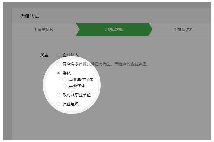 認(rèn)證的政府與媒體類訂閱號(hào)是指:訂閱號(hào)在進(jìn)行微信認(rèn)證時(shí),選擇的主體類型是政府或者媒體。如下圖所示: