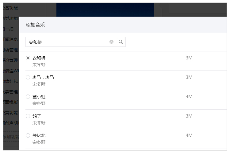 2. 選取音樂時,支持根據歌名、作者進行搜索,并且可以試聽音樂。