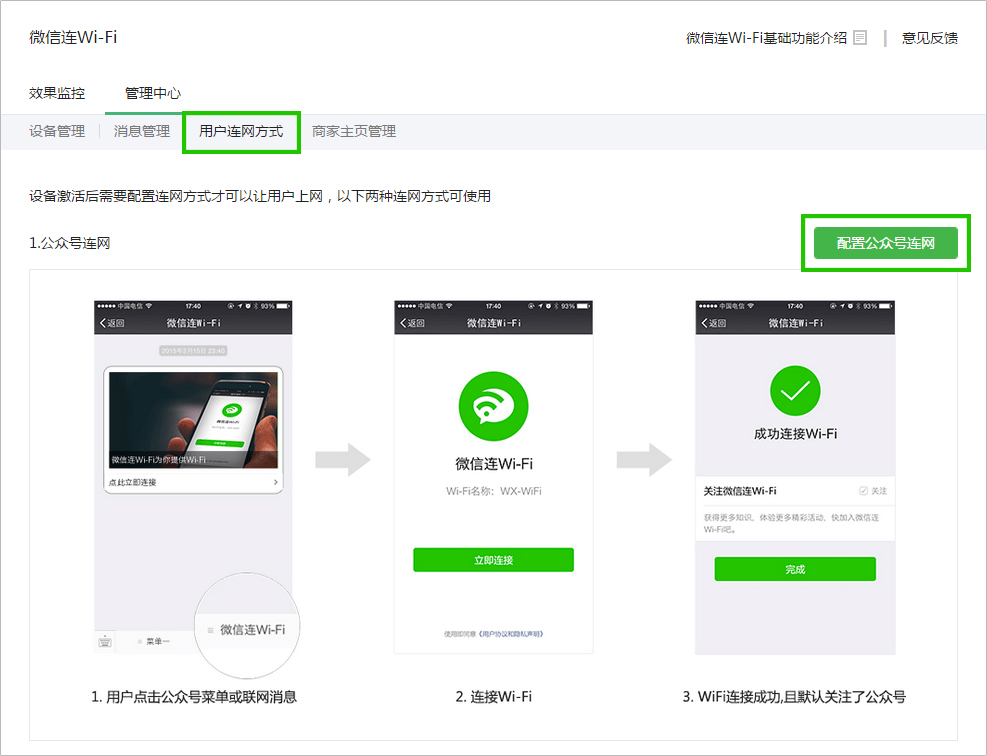 2、選擇“用戶連網(wǎng)方式”,然后點(diǎn)擊“配置公眾號(hào)連網(wǎng)”: