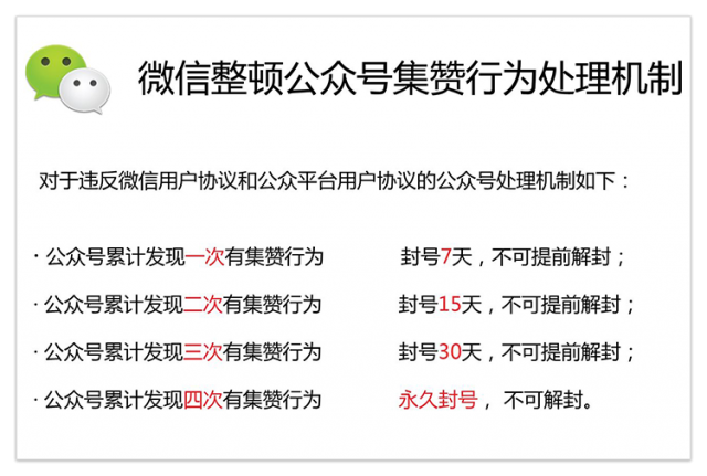 近期,部分商家無視平臺規(guī)則和用戶體驗,屢次利用朋友圈“集贊”,甚至出現預付郵費欺詐、騷擾用戶現象。為保障用戶體驗和利益,6月9日起,我們將升級全新技術手段,采用技術+人工舉報的方式對“集贊”行為進行全平臺清理和規(guī)范。希望大家與微信攜手共建健康、綠色的環(huán)境。詳細處理機制如下:
