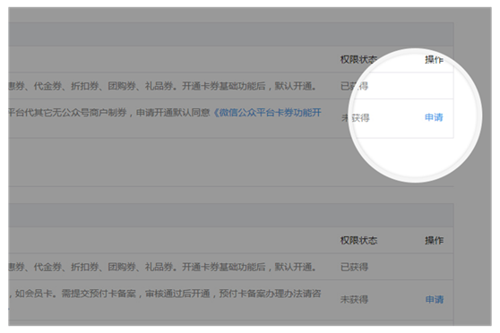 申請路徑:微信公眾平臺-卡券功能-卡券概況-查看資料與權(quán)限頁面,申請“開發(fā)者協(xié)助制券“能力,公眾平臺商戶和接口商戶均有入口申請。