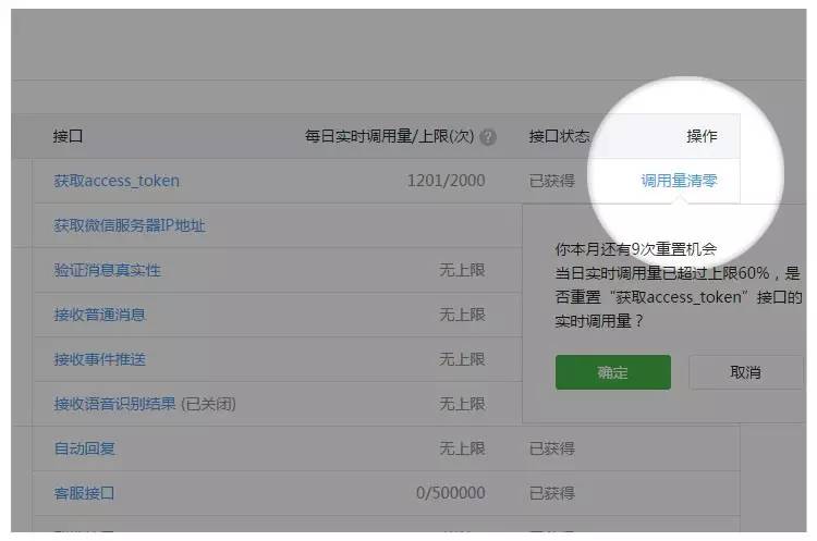 2.當(dāng)接口實(shí)時(shí)調(diào)用量達(dá)到該接口日可調(diào)用上限的60%及以上時(shí),在操作一列出現(xiàn)“調(diào)用量清零”,開發(fā)者可根據(jù)自身需要決定是否清零。