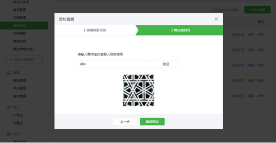 開(kāi)啟功能后,需要添加客服人員,為其綁定微信號(hào),綁定微信號(hào)時(shí)需要客服人員在自己的手機(jī)微信中接受邀請(qǐng)。
