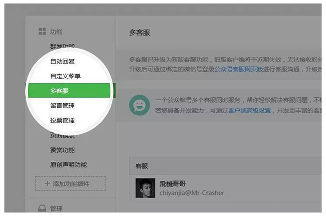 舊版多客服的用戶,請(qǐng)?jiān)?月1日前手動(dòng)升級(jí)到新版網(wǎng)頁(yè)客服功能。升級(jí)時(shí),請(qǐng)登錄微信公眾平臺(tái),在“功能 - 多客服”頁(yè)面中,找到升級(jí)按鈕并點(diǎn)擊,進(jìn)入升級(jí)流程,并為該帳號(hào)下所有客服人員逐一綁定對(duì)應(yīng)的客服人員微信號(hào),所有客服帳號(hào)綁定完成后方可升級(jí)成功。升級(jí)成功后,請(qǐng)使用網(wǎng)頁(yè)版客服功能進(jìn)行客服服務(wù),舊版多客服將失效。