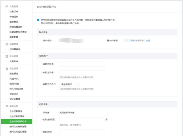 2.進(jìn)入交易中心-企業(yè)付款到銀行卡頁面進(jìn)行付款,API接口將在本周內(nèi)逐步開放。