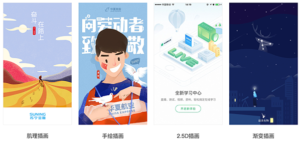 B、插畫:這種形式的閃屏給用戶一種很溫暖的感覺,很容易會引起共鳴,喚起我們某個時間段的回憶。目前,據(jù)天津網(wǎng)站建設(shè)所了解插畫手法用的比較多且比較流行的是:肌理插畫、手繪插畫、漸變插畫等。
