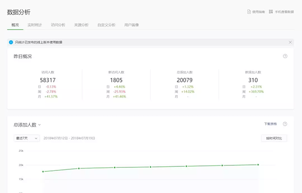 在微信最新版客戶端中,用戶可將使用過的小程序添加為「我的小程序」。已面向開發(fā)者提供「我的小程序」添加數(shù)據(jù),小程序開發(fā)者可登錄微信公眾平臺或使用小程序數(shù)據(jù)助手,查看相關(guān)數(shù)據(jù)詳情:
