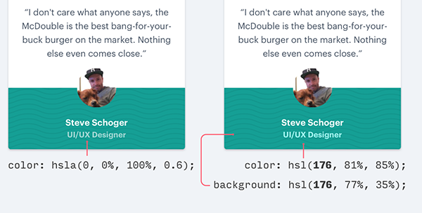 若背景顏色是白色,這時(shí)將黑色的文本改成灰色,不失為一個不錯的淡化其視覺效果的做法,但是若背景是色彩的,那這就是另外一回事了。實(shí)際上,白色背景下文本有黑變灰達(dá)到了降低對比度的效果,但在色彩背景下,想要降低對比度正確的做法就是讓文本逐步的接近背景色,而并非是改為灰色。一般來說,想要降低和背景色之間的對比,通常做法有兩種: