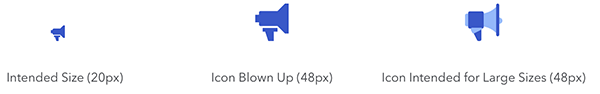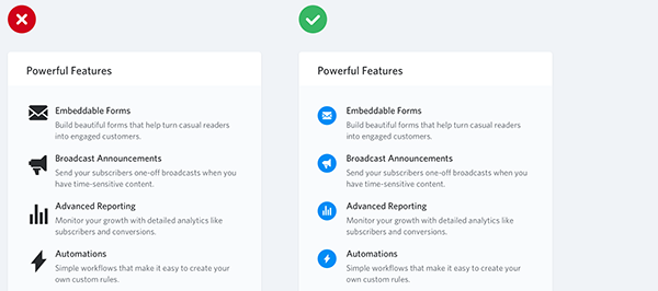 當(dāng)設(shè)計(jì)著陸頁的時(shí)候,可以會突出產(chǎn)品的功能,這時(shí)你需要一些大的圖標(biāo)作為視覺錨點(diǎn),這樣的話你很可能會去 Font Awesome 或 Zondicons 這樣的網(wǎng)站找?guī)讉€免費(fèi)的矢量圖標(biāo),然后將其放大到你所需要的尺寸。雖說矢量圖可以無損的放大,但是一個通常只有16×16 的圖標(biāo)放大三四倍,它固然無損,但是在視覺上就顯得頗為不專注了:缺乏細(xì)節(jié),總感覺過于矮胖。