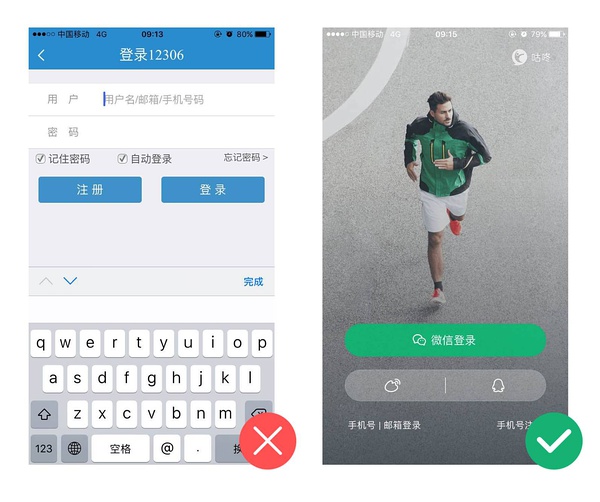 美學(xué)在設(shè)計(jì)產(chǎn)品的使用上扮演著重要的角色。美的設(shè)計(jì)能促進(jìn)人們形成正面積極的態(tài)度,而且讓人們對產(chǎn)品設(shè)計(jì)上的缺陷更具有包容性。如:同樣都是登錄頁面我們更容易接受右面的設(shè)計(jì),并且我們會通過是否美觀推斷右面的APP應(yīng)該更好用,畢竟一個好用的APP應(yīng)該都會好好“打扮”一下吧!