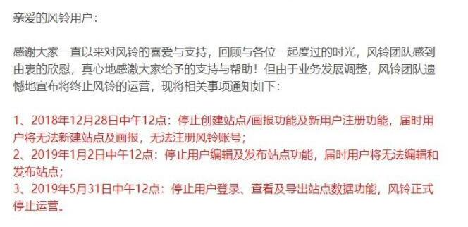 1、2018年12月28日中午12點:停止創(chuàng)建站點/畫報功能及新用戶注冊功能,屆時用戶將無法新建站點及畫報,無法注冊風(fēng)鈴賬號;