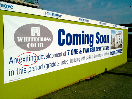 比如說上面這個(gè),本來應(yīng)該拼成”exciting”令人振奮的發(fā)展(大開發(fā)),結(jié)果拼成了”exiting”退出發(fā)展。意思正好截然相反。
