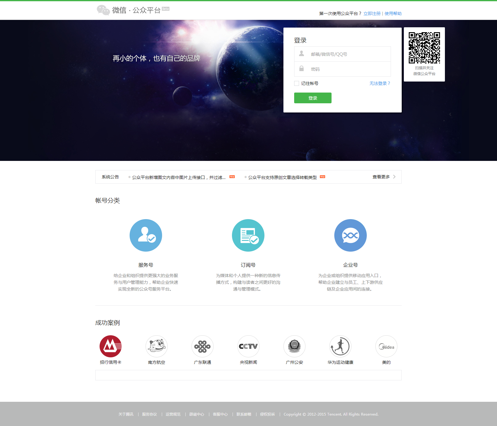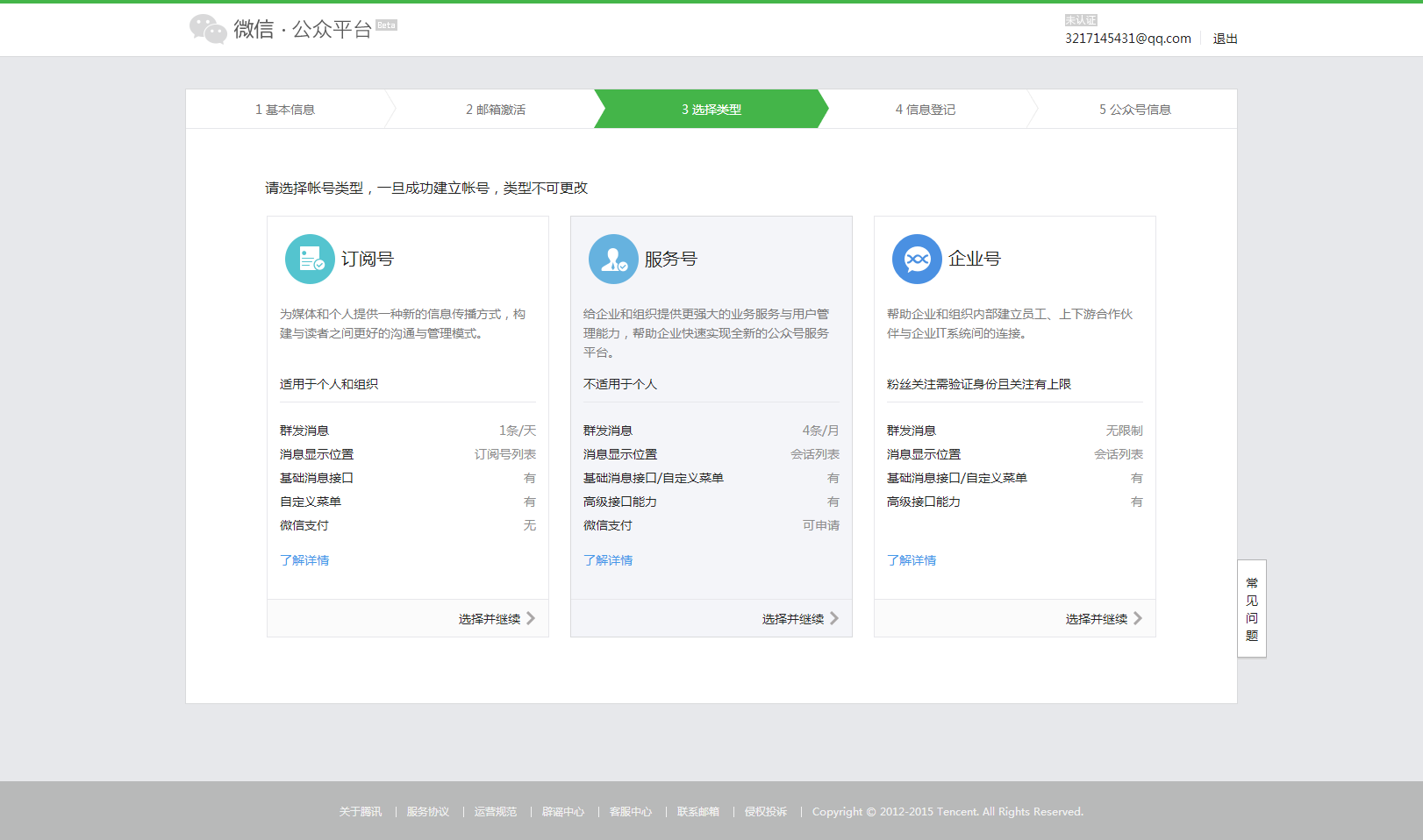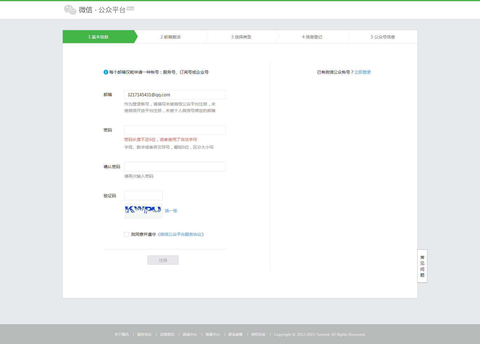 2、注冊過QQ賬號以后,登錄到https://mp.weixin.qq.com/的頁面,進(jìn)行企業(yè)微信服務(wù)號的注冊。如圖: