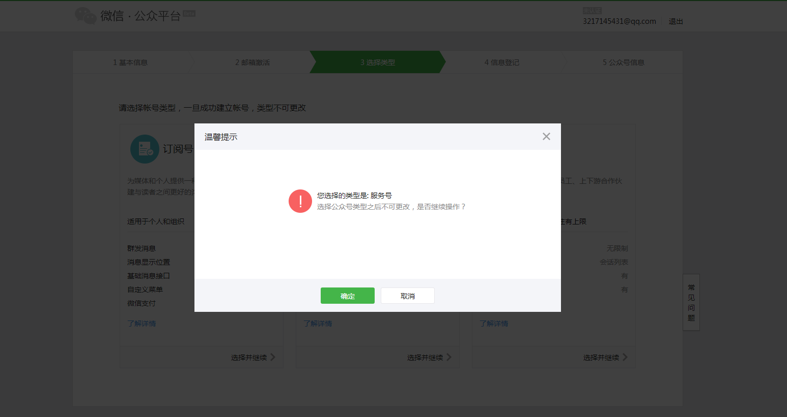 不管是選擇服務(wù)號還是訂閱號只能有一次選擇的機(jī)會,選擇過后就不能進(jìn)行修改,當(dāng)您選擇過后會彈出一個窗口,如圖:
