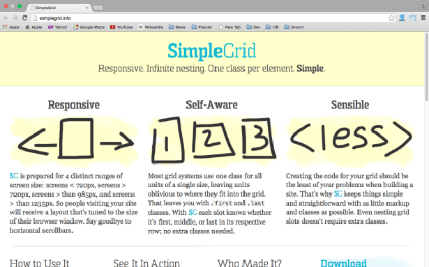 Joni Korpi的開發(fā)和Less Framework是同一人,近期已經(jīng)發(fā)布了這個(gè)可靠的Grid系統(tǒng)的新版本。因?yàn)槠湟子谶m應(yīng)從16個(gè)到8個(gè)到4個(gè)欄,被視為“折疊式”。Golden Grid System還具有另一個(gè)特色,可以在測(cè)試時(shí)用一個(gè)小型瀏覽器覆蓋您所制作的頁面上的Grid。