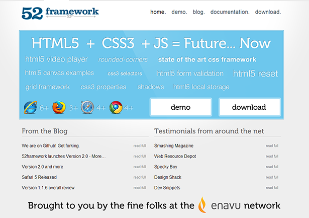 52 Framework主要用于優(yōu)化HTML5和CSS3的跨瀏覽器兼容性的框架,可在所有主流瀏覽器上運(yùn)行。