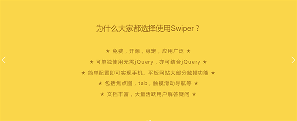Swiper是一款免費、輕量級的移動設備觸控滑塊的js框架,使用硬件加速過渡(如果該設備支持的話)。主要使用于移動端的網(wǎng)站 。其實類似這樣的滑動插件的效果庫非常多,但像他這樣,文檔能做的那么專注的就很少鳥。所以推薦推薦哦!