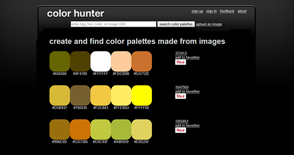 ColorHunter在線配色篩選工具是一個可以按照圖片來自動生成相應(yīng)的不同調(diào)色板,也就是配色方案。如果你想尋找某種風格的配色方案,可以在網(wǎng)站上方的搜索區(qū)域進行相應(yīng)的搜索。除了根據(jù)圖片來尋找配色外,你還可以輸入tag名稱、16進制顏色值或Flickr網(wǎng)站中的照片(圖片)網(wǎng)址進行搜索。