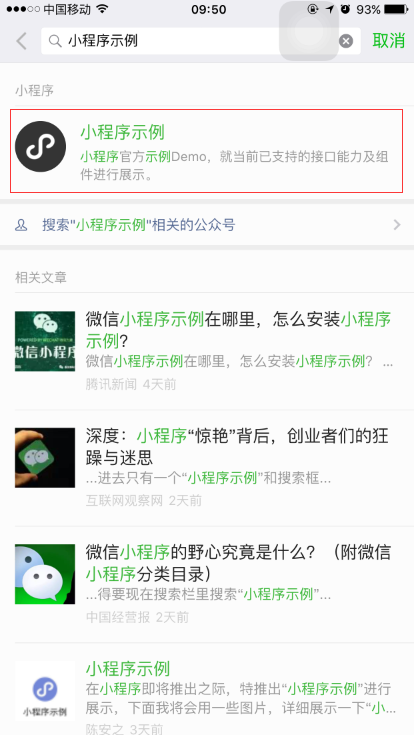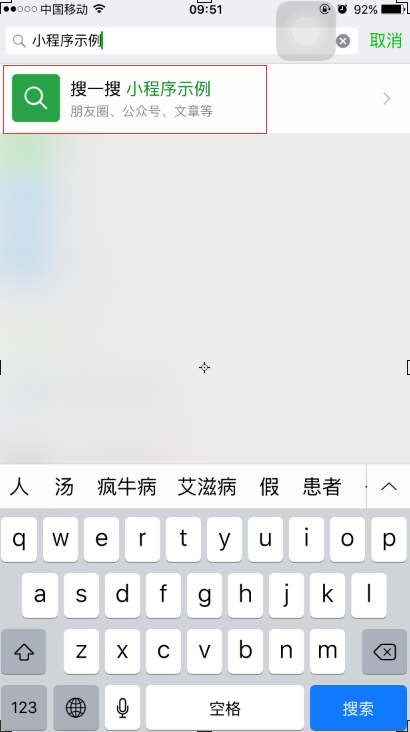 2、在微信的⑴個(gè)頁面頂端,有一個(gè)搜索條,在搜索條里輸入:小程序示例,然后點(diǎn)擊搜索。