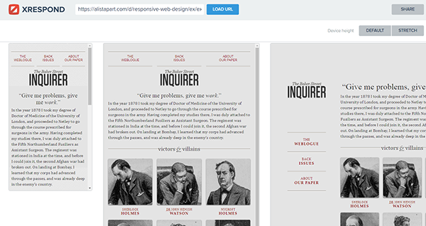 Xrespond絕對對得起“虛擬設備實驗室”,這個稱號,通過Xrespond 打開網(wǎng)頁,你可以看到它在不同屏幕尺寸下的樣子,整個布局是橫向的,所以你需要橫向滾動頁面才能看到它所有的樣子。屏幕上方的標簽會標識出它是為什么設備所匹配的,在下拉框當中能夠選出不同品牌不同型號的智能手機、平板和筆記本屏幕,以預覽效果。