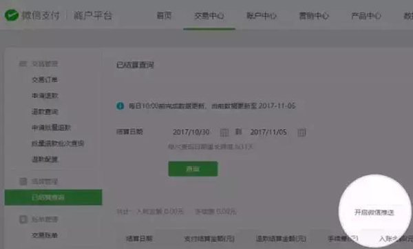 為及時接收到每日交易款結(jié)算提現(xiàn)情況的通知,商戶可以通過電腦登錄微信支付商戶平臺-交易中心-已結(jié)算查詢,點(diǎn)擊“開啟微信推送”,根據(jù)頁面操作流程開通每日交易款結(jié)算情況通知功能;開通后,將于每日早上10點(diǎn)前通過微信支付商戶助手公眾號接收到前一日結(jié)算情況,以及結(jié)算款自動提現(xiàn)進(jìn)展。