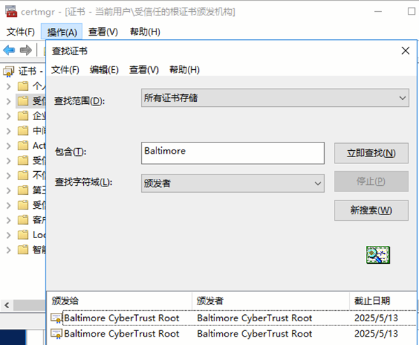 或者在控制臺(tái)窗口運(yùn)行certmgr.msc,在操作菜單欄中打開(kāi)查找證書(shū),在所有頒發(fā)給域中搜索包含Baltimore,如果顯示有頒發(fā)給BaltimoreCyberTrustRoot的證書(shū)則不需要更新證書(shū)。