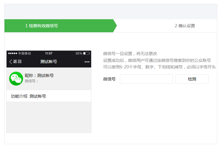 當(dāng)新帳號(hào)信息審核通過(guò)后,可在“公眾號(hào)設(shè)置”進(jìn)行微信號(hào)設(shè)置。運(yùn)營(yíng)者可先檢測(cè)預(yù)設(shè)的微信號(hào)是否可用,若可用再進(jìn)行下一步操作。此外,設(shè)置微信號(hào)時(shí),運(yùn)營(yíng)者直接可見(jiàn)微信內(nèi)該公眾帳號(hào)的微信號(hào)展示效果,提升用戶對(duì)微信號(hào)的理解。
