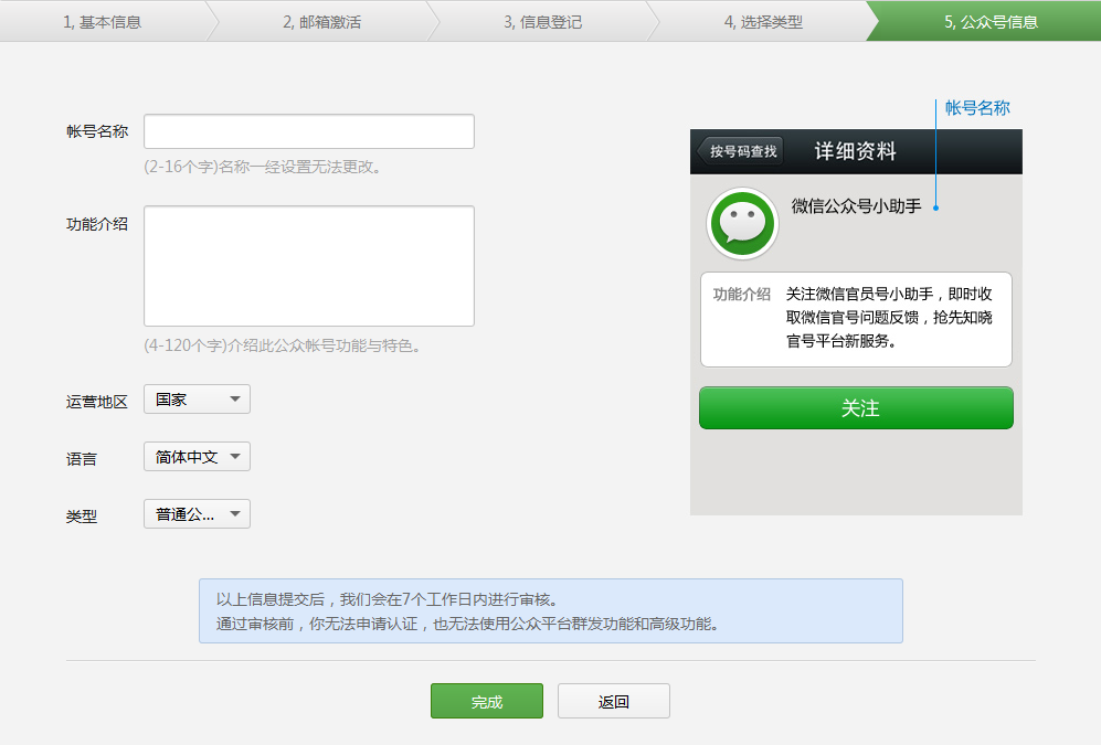 8、我們點(diǎn)擊“繼續(xù)”后,就直接到了“公眾號信息”選項(xiàng)卡里面,在這里我們要輸入帳號名稱、功能介紹、地區(qū)等信息認(rèn)真填寫,在功能欄里一本是填寫企業(yè)簡介。帳號名稱也只有一次機(jī)會,確定后是不能更改的。所有填寫完成后,我們直接點(diǎn)擊“完成”。如下圖所示: