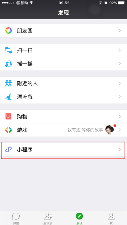 5、退出上面這個(gè)頁(yè)面,點(diǎn)開(kāi)你的微信第三頁(yè)面“發(fā)現(xiàn)”,你會(huì)發(fā)現(xiàn),再出現(xiàn)面出現(xiàn)了小程序的入口。