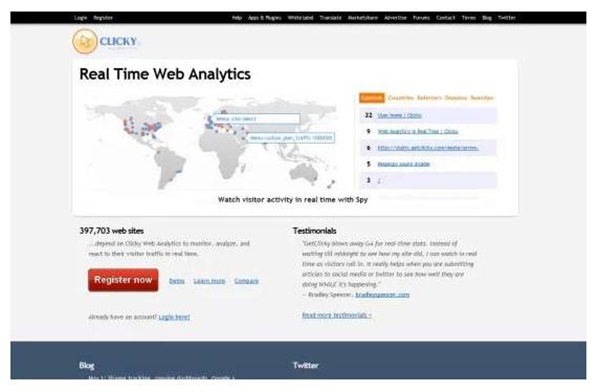 Google Analytics是一個使用非常廣泛的訪問統(tǒng)計工具,目前它推出了一系列的新的功能,可以提供實時報告。你可以看到你的網(wǎng)站中目前在線的訪客數(shù)量,了解他們觀看了哪些網(wǎng)頁、他們通過哪個網(wǎng)站鏈接到你的網(wǎng)站、來自哪個國家......。