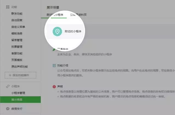 公眾平臺(tái)支持兩種方式設(shè)置小程序展示在“附近的小程序”。
