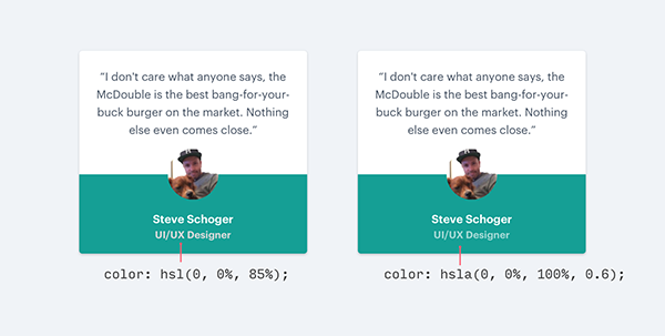 在白色背景下,合理的淡化視覺效果的做法是將黑色文本改成灰色,但這種方式在 彩色背景下并不適用。實(shí)際上,在白色背景下文本由黑變灰是為了降低對比度,但在彩色背景下,想要降低對比度是應(yīng)該讓文本逐步接近背景色,而并非改成灰色,若想要降低和背景色之間的對比,通常采用如下方式: