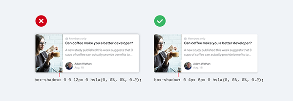 與大面積擴(kuò)散模糊陰影相比,使用微妙的垂直偏移陰影效果更明顯,更自然,它模擬了最常見的光源特征,光線從上往下照下來從而營造陰影效果,如果你對此有興趣,Material Design Guideline非常清晰講述了這樣陰影的制作細(xì)節(jié)。