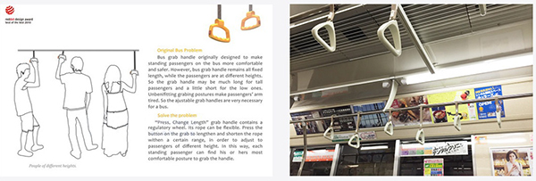 長度不一的扶手設(shè)計(jì),在國內(nèi)很多的乘客應(yīng)該也已經(jīng)發(fā)現(xiàn),其實(shí),這一設(shè)計(jì)最早是在2010年的德國紅點(diǎn)設(shè)計(jì)中早有體現(xiàn),「Press, Change Length」是一個(gè)可調(diào)節(jié)長度的拉手,由中國學(xué)生設(shè)計(jì),出發(fā)點(diǎn)是為了讓身高不同的乘客以更舒服的姿勢(shì)握著扶手站立。在日本,這種設(shè)計(jì)被譽(yù)為「貧困」的美學(xué)—用最簡(jiǎn)單的東西創(chuàng)造一種深入人心的生活方式,有時(shí),不得不說懂得運(yùn)用設(shè)計(jì)結(jié)果比設(shè)計(jì)過程更加重要。