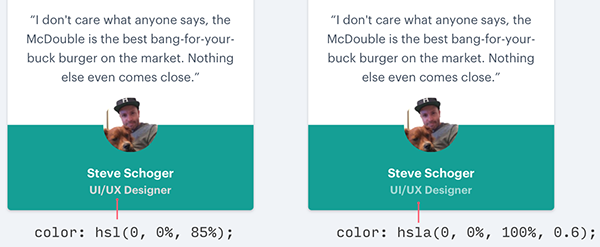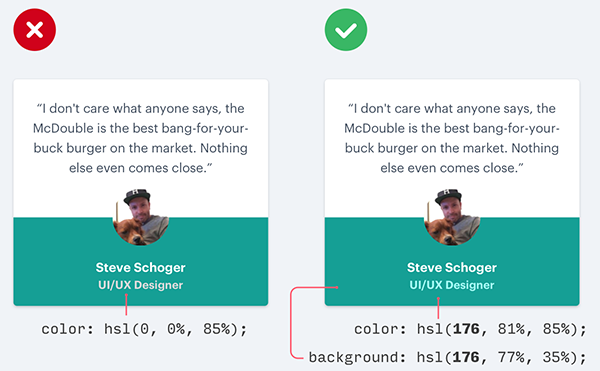 若背景顏色是白色,這時(shí)將黑色的文本改成灰色,不失為一個不錯的淡化其視覺效果的做法,但是若背景是色彩的,那這就是另外一回事了。實(shí)際上,白色背景下文本有黑變灰達(dá)到了降低對比度的效果,但在色彩背景下,想要降低對比度正確的做法就是讓文本逐步的接近背景色,而并非是改為灰色。一般來說,想要降低和背景色之間的對比,通常做法有兩種: