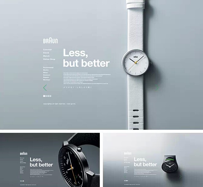 例如:“獸人必須死”首發(fā)引導頁面,周圍大面積留白,并結(jié)合簡潔的排版,讓頁面模塊之間區(qū)分明顯,視覺集中,很好的給用戶引導,給人一種精致和輕松感。例如:BRAUN博朗,整個頁面,簡潔的圖片與文字的排版,讓視線非常集中,這樣用戶快速的將注意力集中到內(nèi)容上去,非常符合他們的主題“Less,but better”,給人留下回味、想象的空間。