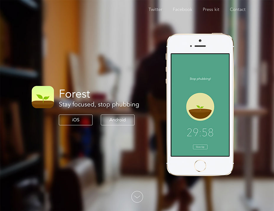 Forest是一款能夠幫助用戶以30分鐘為單位集中時間和注意力的工作效率提升應(yīng)用,觀察其登陸頁的設(shè)計會給人一種看起來比較松散,近似極簡主義的感覺,但是該設(shè)計仍然很好地解釋了產(chǎn)品簡單而上檔次的理念,非常受用戶的青睞。