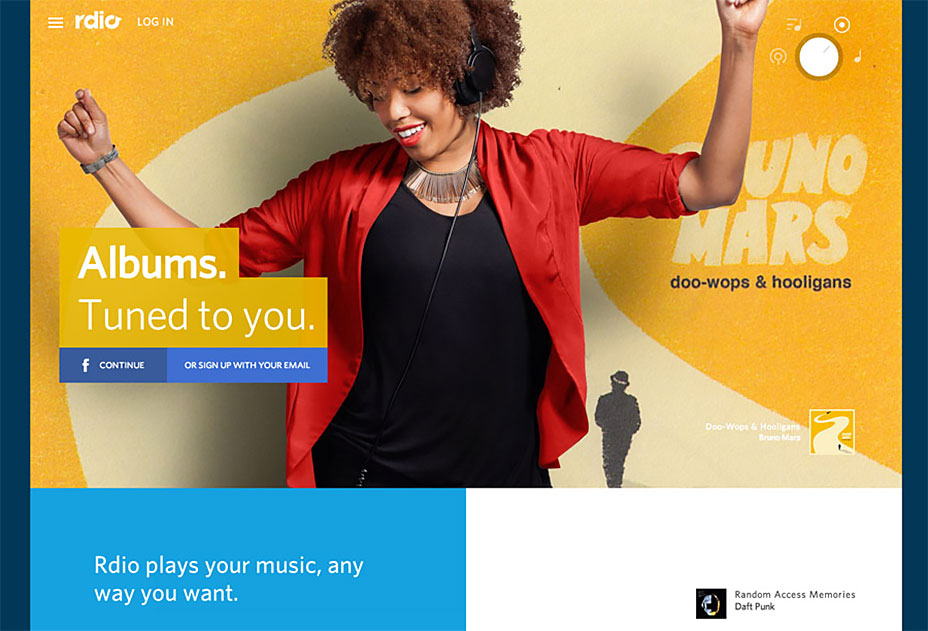 喜歡玩音樂的人應(yīng)該對Rdio有所了解,它是一款提供在線音樂服務(wù)的網(wǎng)站,其擁有一套制作精良、優(yōu)秀的登陸頁。頁面的設(shè)計非常的典雅、簡潔,設(shè)計中采用了大量留白空間和大幅的滿屏圖片,營造出能夠吸引眼球的大膽設(shè)計。