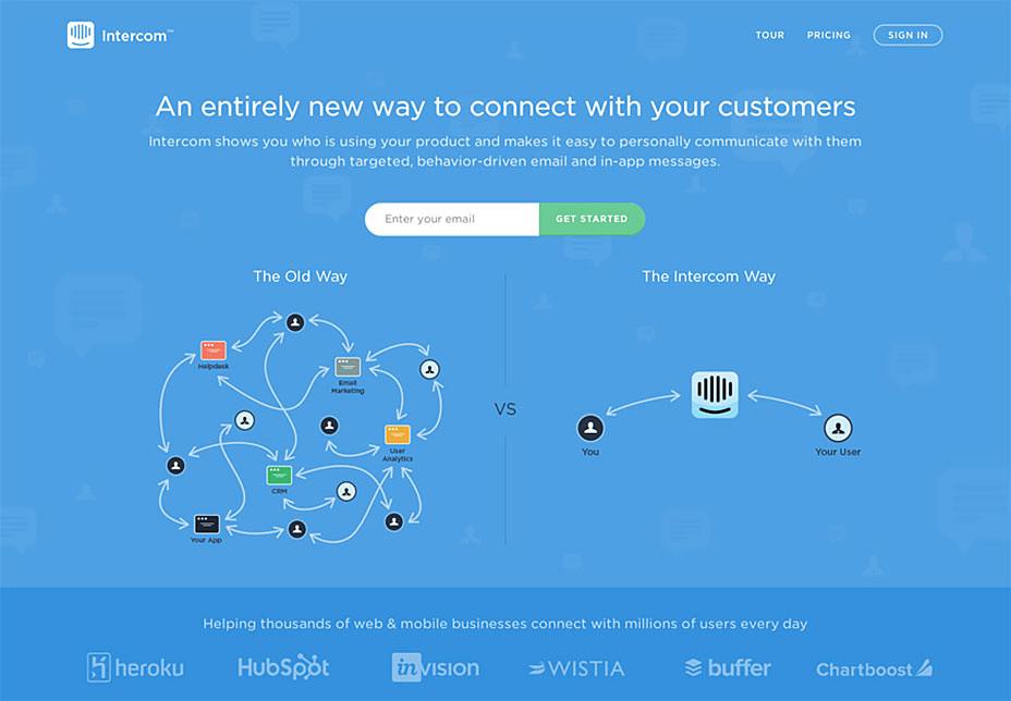 Intercom服務(wù)可幫助用戶提高向客戶發(fā)送電子郵件的效率。其登陸頁采用了相對比較復雜的理念以便大家理解產(chǎn)品工作原理以及好處所在。這個設(shè)計中我最喜歡的是對比展示舊有工作方式和Intercome的簡便方法。