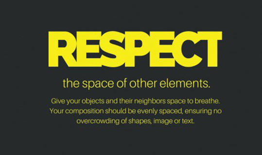“Respect”這個(gè)詞的字間距被壓縮,從而讓整個(gè)單詞都顯得更有凝聚力,讓人感到和諧,舒服。在平面設(shè)計(jì)中排版的位置是非常重要的,因此各種元素間距需要根據(jù)實(shí)際情況來調(diào)整,當(dāng)內(nèi)容多的時(shí)候可以適當(dāng)收緊,當(dāng)少的時(shí)候可以適當(dāng)放松。同時(shí)還有間距大小都需要兼顧到基本的可讀性,不宜分太開,同時(shí)也不易離太近,這樣的話很容易在一定的程度上增加了閱讀的難度。