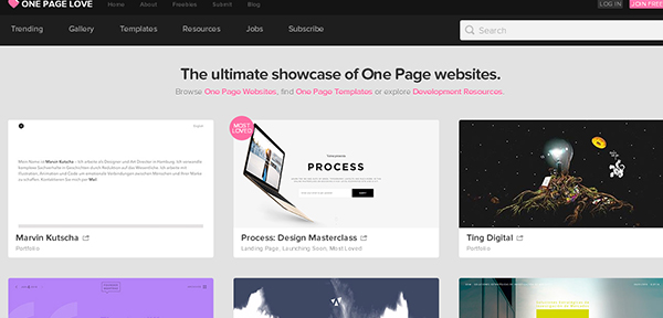 One Page Love網(wǎng)站值得所有從事網(wǎng)站設(shè)計(jì)的設(shè)計(jì)師收藏,它一個(gè)提供海量單頁模版展示和素材資源的網(wǎng)站,是網(wǎng)頁設(shè)計(jì)師尋找靈感和獲取精美網(wǎng)頁設(shè)計(jì)較好的站點(diǎn),該網(wǎng)站于2006年成立,成立至今一直都發(fā)展的很好,截止到目前已收錄30多種行業(yè)分類的模版。