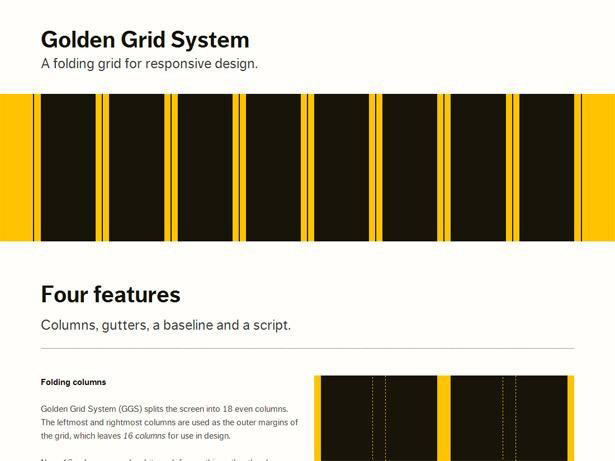 Joni Korpi的開發(fā)和Less Framework是同一人,近期已經(jīng)發(fā)布了這個(gè)可靠的Grid系統(tǒng)的新版本。因?yàn)槠湟子谶m應(yīng)從16個(gè)到8個(gè)到4個(gè)欄,被視為“折疊式”。Golden Grid System還具有另一個(gè)特色,可以在測(cè)試時(shí)用一個(gè)小型瀏覽器覆蓋您所制作的頁面上的Grid。