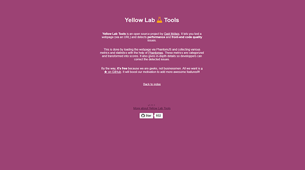 Yellow Lab Tools 是 Ga?l Métais 開發(fā)的一款新型網(wǎng)頁效能及前端質(zhì)量測試工具。此工具給你大量信息及一些在其他工具無法看到的獨(dú)特功能,例如頁面加載時(shí) JavaScript 與 DOM 互動(dòng)和其他程序代碼驗(yàn)證問題。