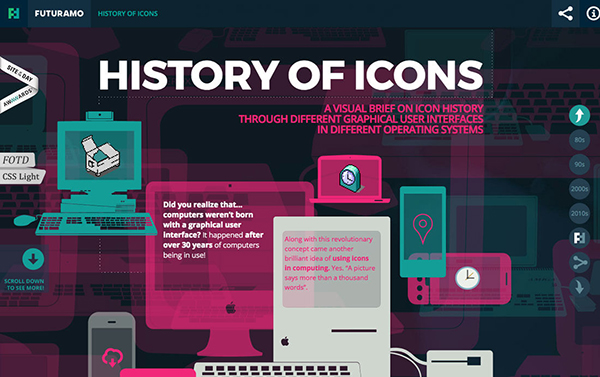 圖標(biāo)設(shè)計需要契合整個設(shè)計策略,仔細(xì)審視你所需要設(shè)計的內(nèi)容和風(fēng)格,再將圖標(biāo)和流行的元素結(jié)合起來,營造出符合現(xiàn)代風(fēng)格的美學(xué)特征。另外,圖標(biāo)最大的特性就是它具有靈活性,它從形狀到細(xì)節(jié)都可以充滿藝術(shù)性,從手繪風(fēng)到扁平化,從精致擬物到藝術(shù)化處理都很容易實(shí)現(xiàn)。而上面這個關(guān)于圖標(biāo)歷史的網(wǎng)站就展示了多年來圖標(biāo)風(fēng)格的演變,這些圖標(biāo)所呈現(xiàn)出來的風(fēng)格、色彩、使用方法和規(guī)格都非常值得設(shè)計師們研究學(xué)習(xí)。