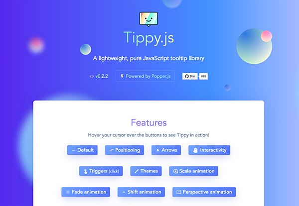 Tippy是一款輕量級的純JS工具提示庫,其中包含了大量不同的交互相關的提示內容,它的出現(xiàn)對設計師的工作有很大的幫助,并且它的兼容性非常的好,幾乎可以適用于任何瀏覽器,這也使得它幾乎可以輕松實現(xiàn)各種各樣的提示效果。